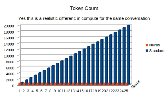 Because of the way nexus manages the models memory through a conversation, we don't just save a little bit of compute, when I said they were throwing compute away with standard AI, I am not exaggerating at all. (BTW token count is about 4 characters to 1 token, close enough to get the idea at least.. hopefully)